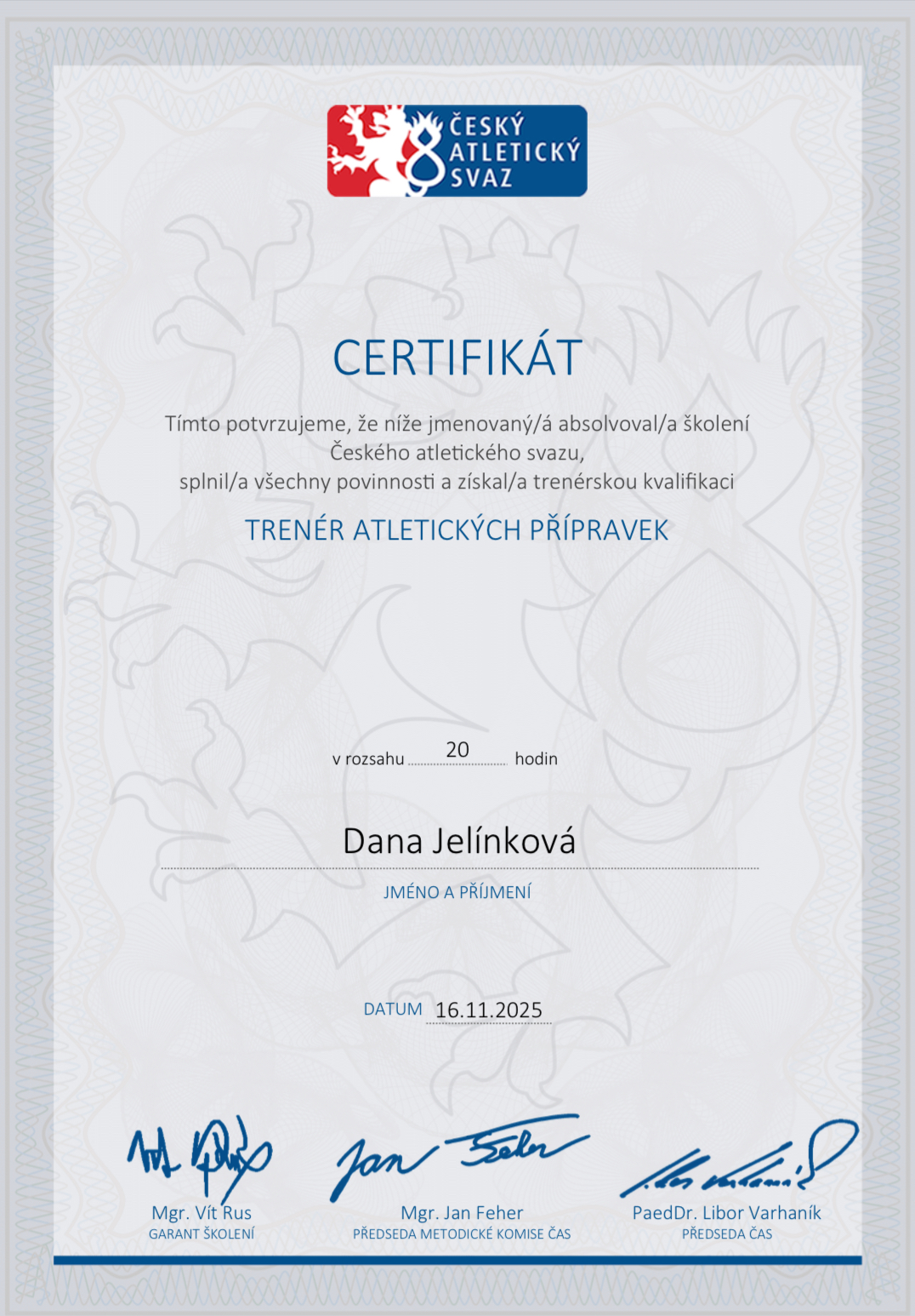 V roce 2015 jsem založila oddíl atletiky BĚHÁLEK při SK Sokolu Zlatníky. Zde působím jako hlavní trenér žactva, dorostu a přípravky.